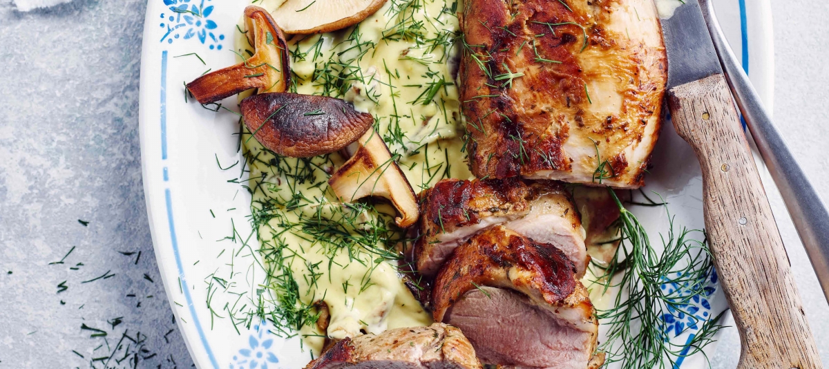 Clean the chanterelles, rinse them quickly and dry them well. Put 1 tbsp butter into a large casserole pan, add the diced onion and cook on medium heat, stirring constantly. Add the chanterelles, turn up the heat and fry for about 2 minutes, stirring constantly. Season with salt, pour in the wine or stock and allow to evaporate on high heat for about 1 minute. Stir in the cream and bring to the boil. Lastly, add the chopped dill and turmeric (optional). Remove the pan from the heat. Rinse the tenderloin, dry it well, remove the membrane with a sharp knife and cut into 1.5 cm slices. Season with salt and pepper. Preheat a pan, add 1 tbsp butter. When the butter is hot enough, add the sliced tenderloin. Fry for 2 minutes on high heat until the meat is brown on the bottom side. Flip over and fry the other side. Transfer the fried meat to the pan containing the sauce and heat for another 1-2 minutes.