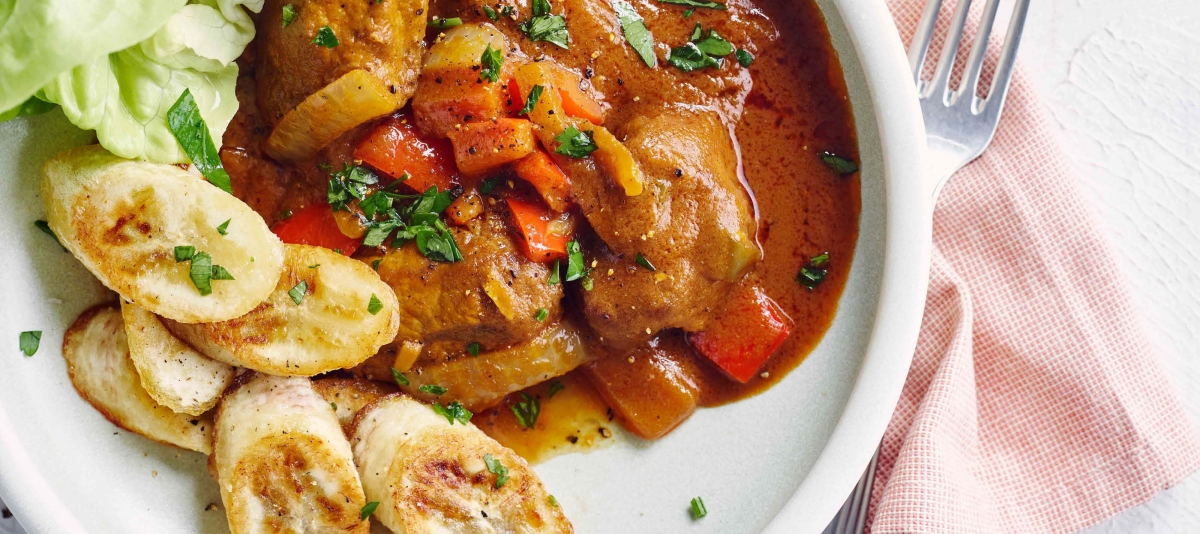 Dans un bol, mélangez le gingembre, l’ail, les flocons de piment rouge, la sauce soja, le bouillon et le beurre de cacahuète. Faites chauffer de l’huile dans une grande casserole et faites d’abord revenir l’oignon et le poivron. Ajoutez la viande et faites-la revenir jusqu’à ce qu’elle soit dorée sur tous les côtés. Ajoutez la marinade d’épices, de bouillon et de soja. Laissez mijoter à couvert pendant 15 minutes. Ajoutez le concentré de tomates et laissez cuire pendant 15 minutes supplémentaires. Pendant ce temps, faites cuire les bananes dans un peu d’huile. Servez le plat avec les bananes plantains et une feuille de laitue.