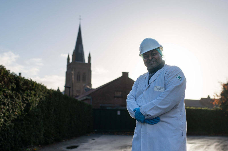 On n’a jamais une seconde chance de faire une bonne première impression et ça, Michel (56 ans) le sait mieux que quiconque. À une époque, notre Magic Mike faisait la navette entre son domicile à Kortemark et le site de Lovenfosse, près de Liège. Mais désormais, il travaille plus près de chez lui, à Westvlees. Le respect des règles d’hygiène est son cheval de bataille : il est en partie chargé de veiller à ce que le personnel et les visiteurs disposent en suffisance de filets à cheveux, de filets à barbe, de gants et de casquettes ou encore de savon pour se laver les mains.